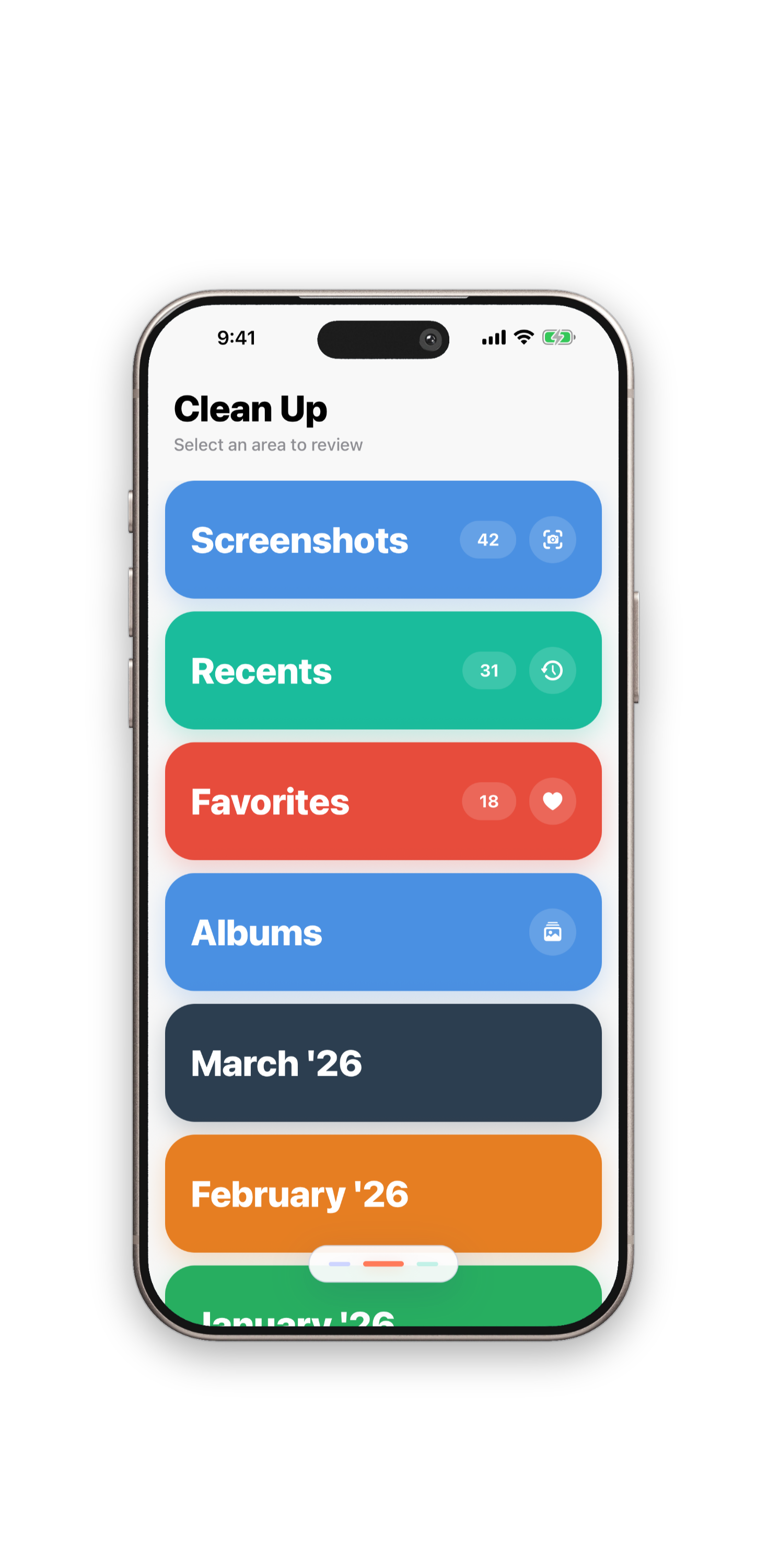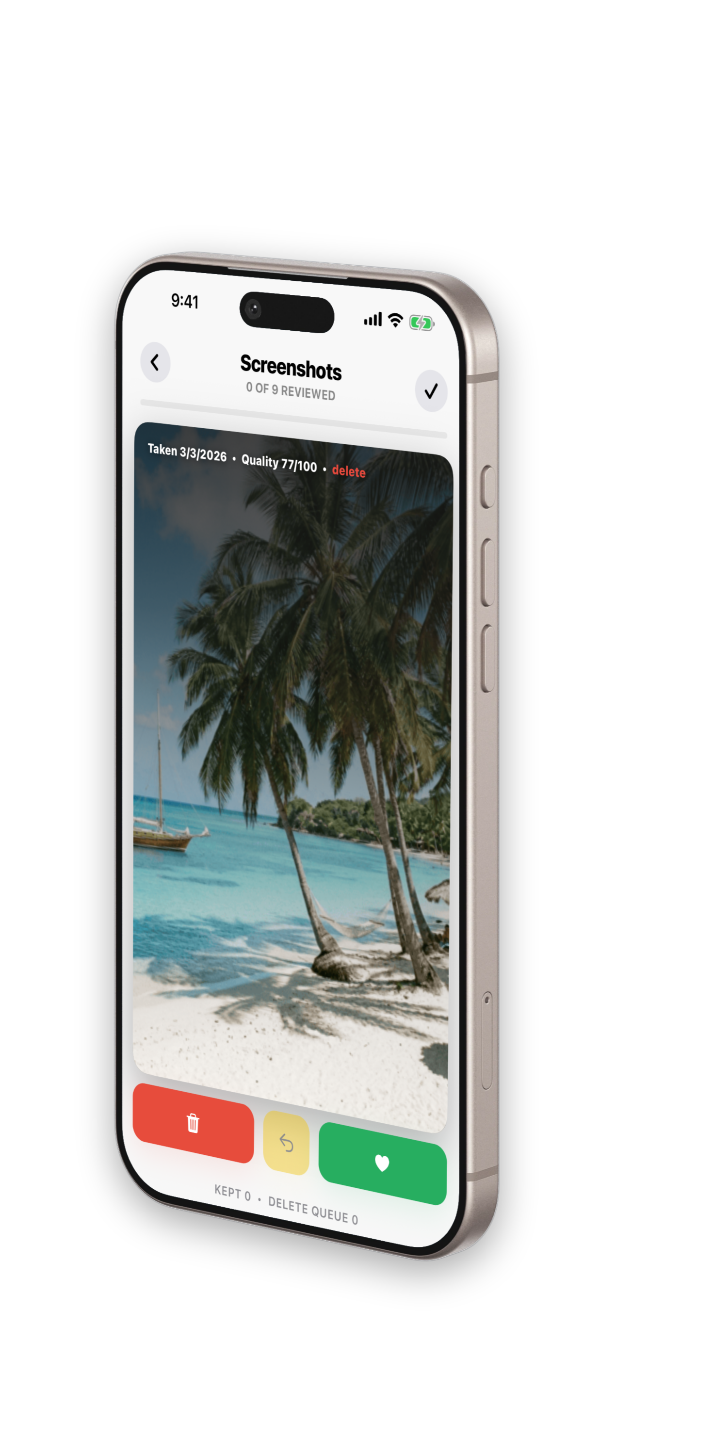 Keep or delete in seconds with a tactile triage flow.