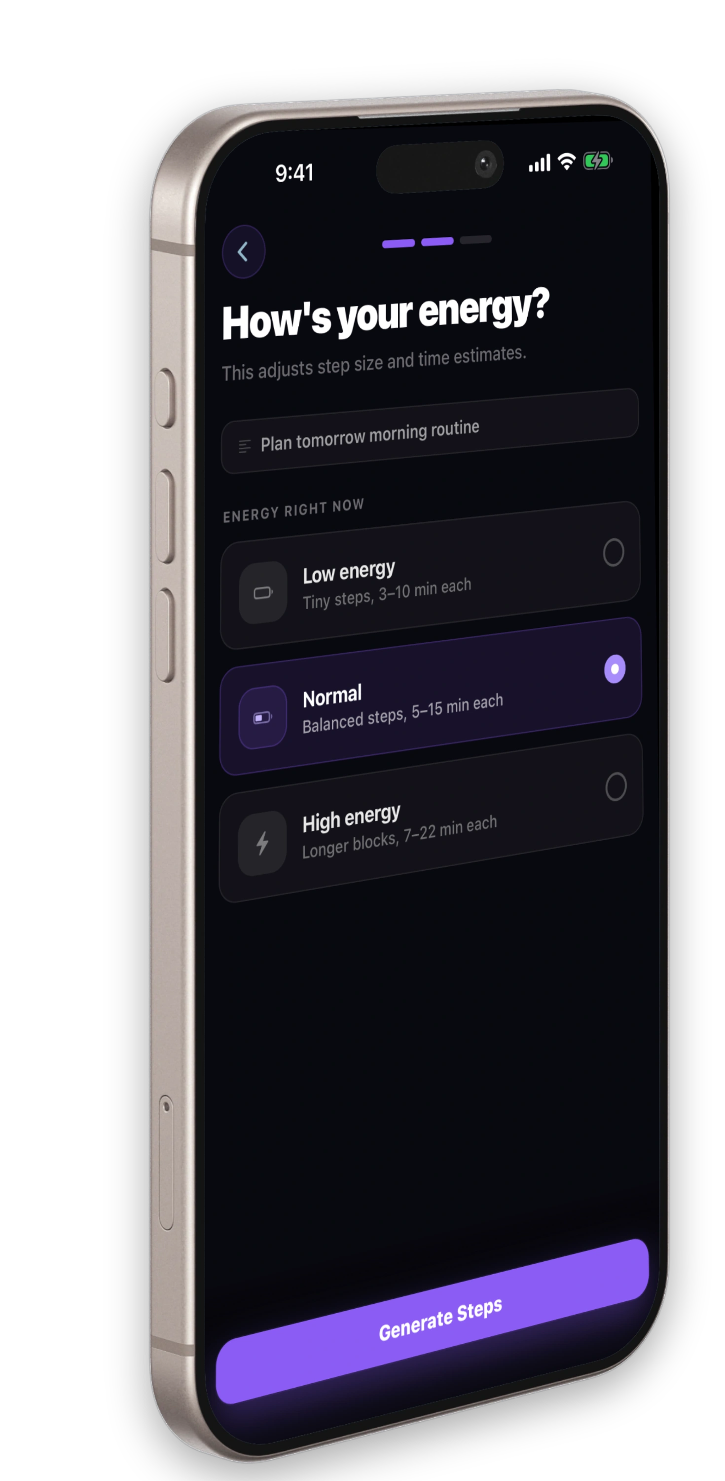 Low, Normal, or High — the plan adapts step count and difficulty to match how you actually feel right now.