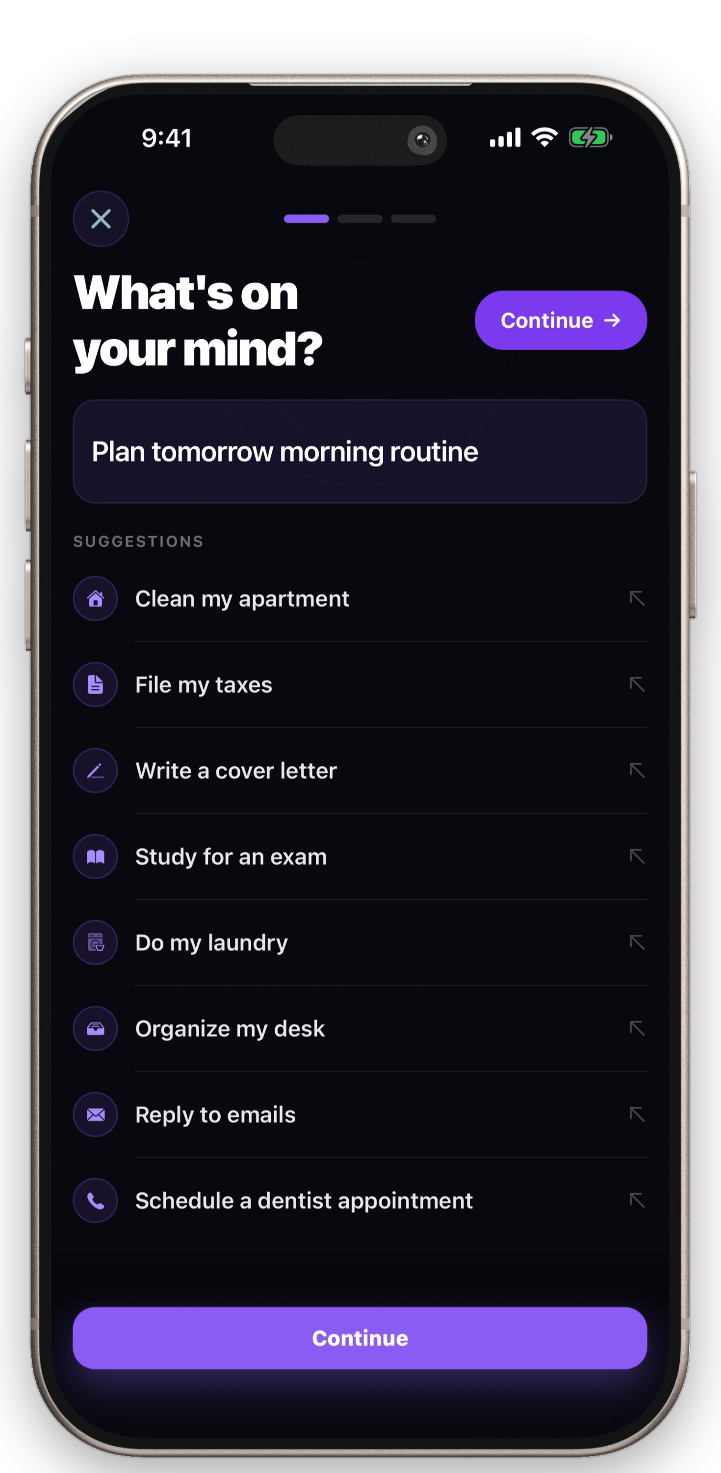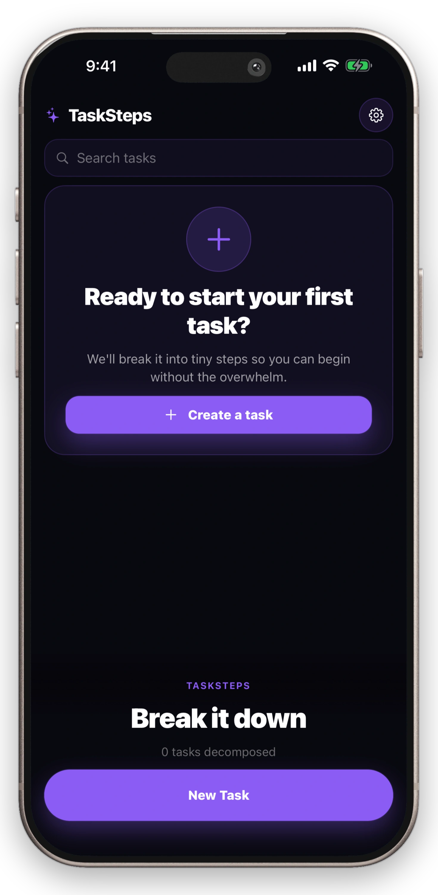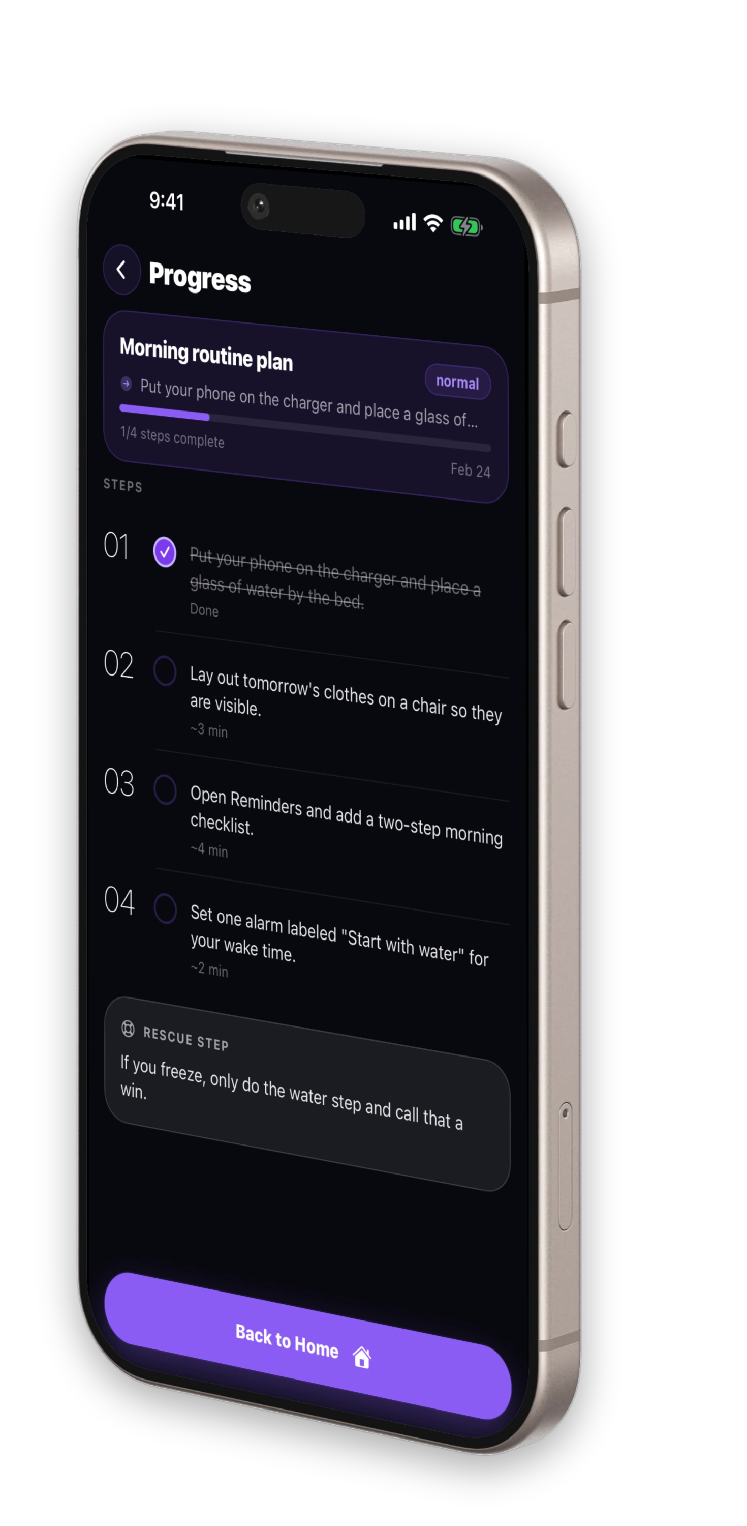 The app reduces ambiguity and decision load so starting becomes the easy part. Describe what feels overwhelming and get a plan that meets you where you are.